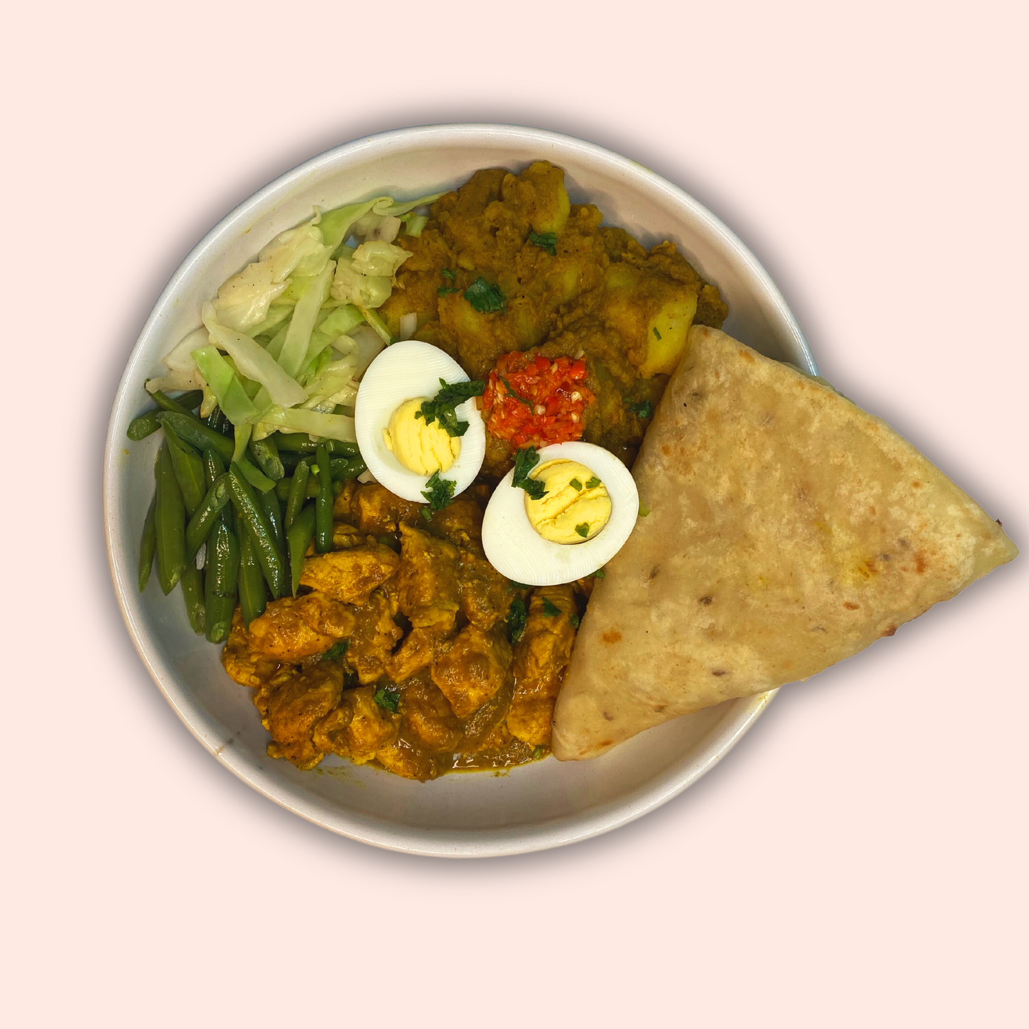 Curry with authenthic spices served with chicken or shrimps and white rice or one large roti.