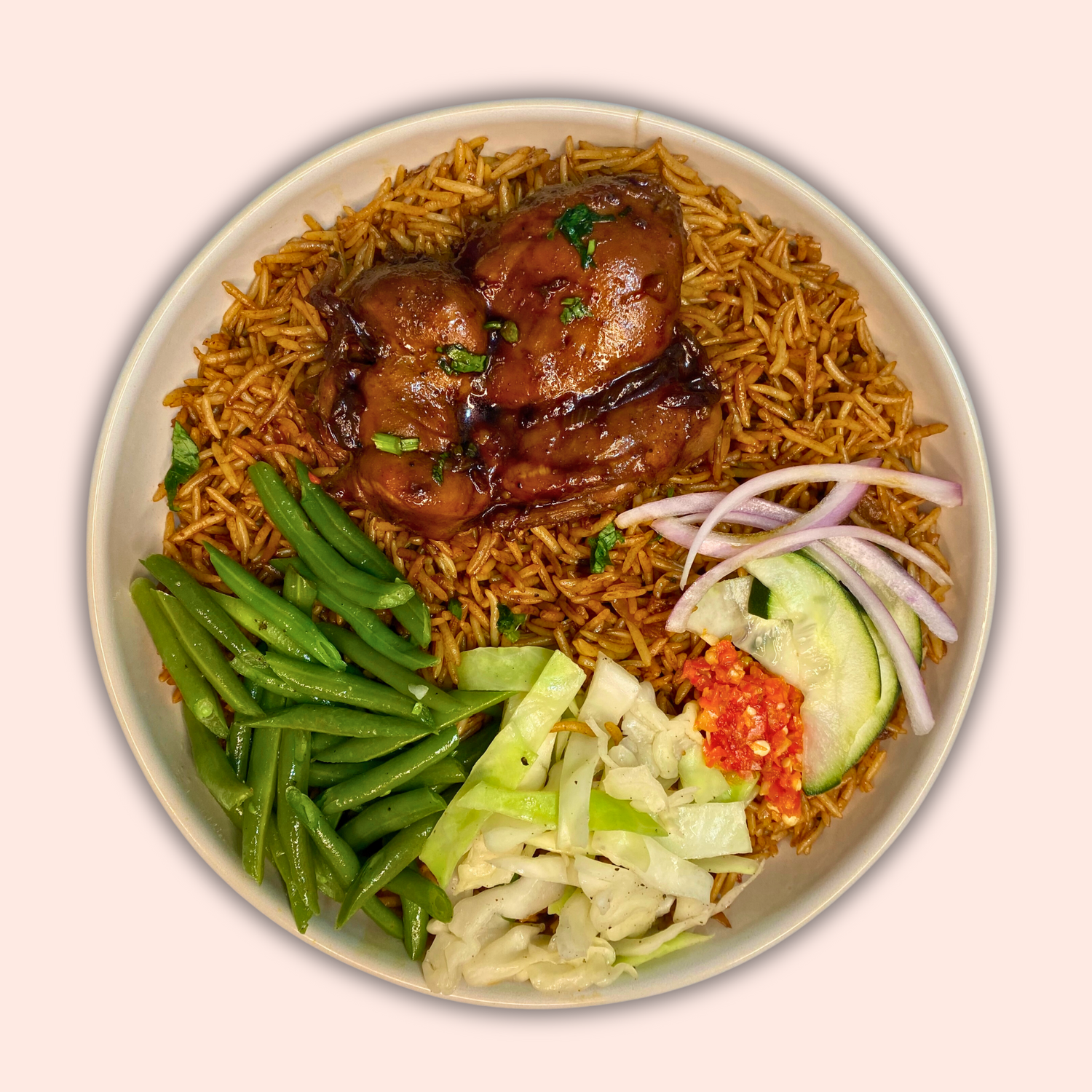 Fried rice with authenthic spices served with chicken of choice, vegetables and pickles.