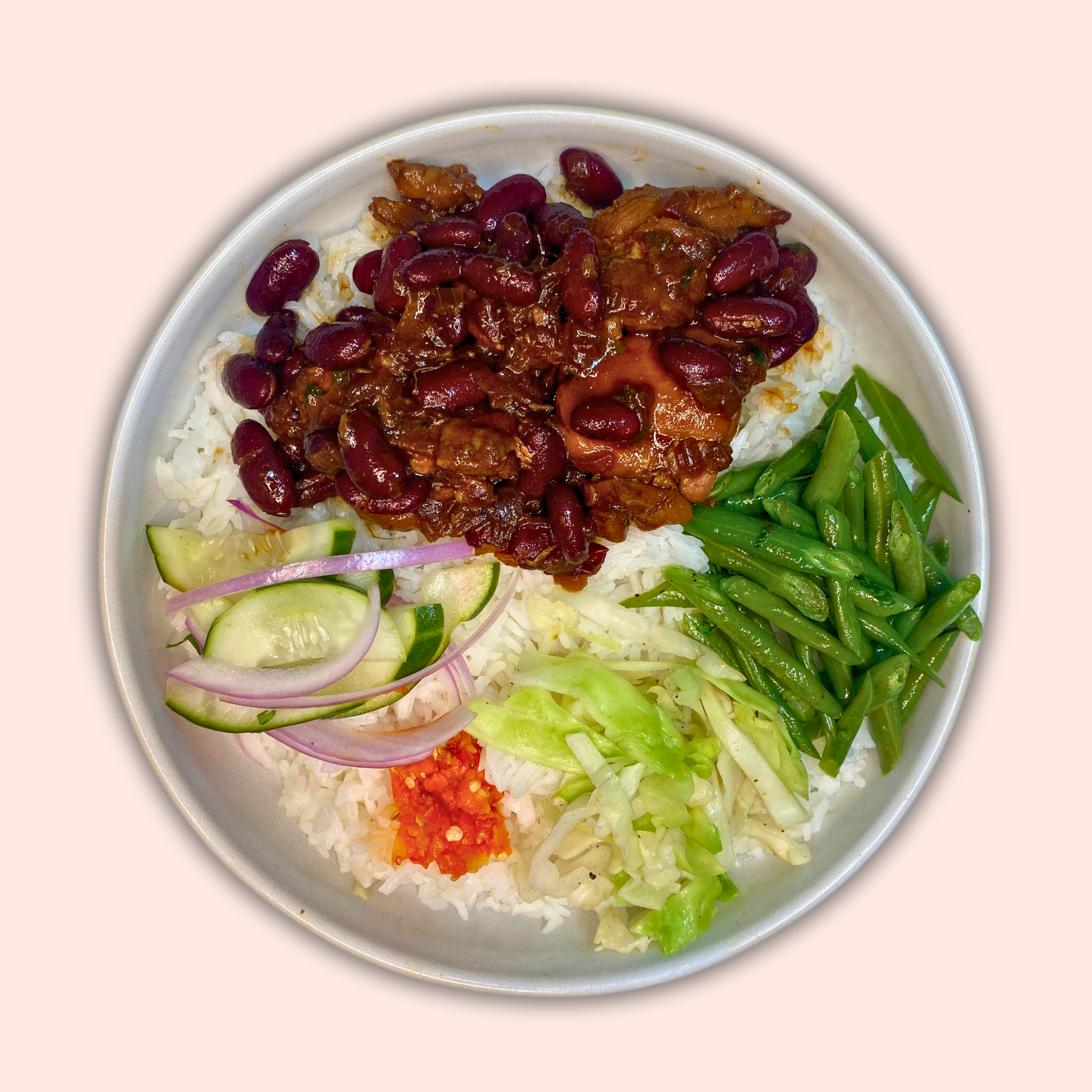 Perfectly cooked white rice served with ketjacp chicken, black beans, vegetables, zuurgoed and chili.